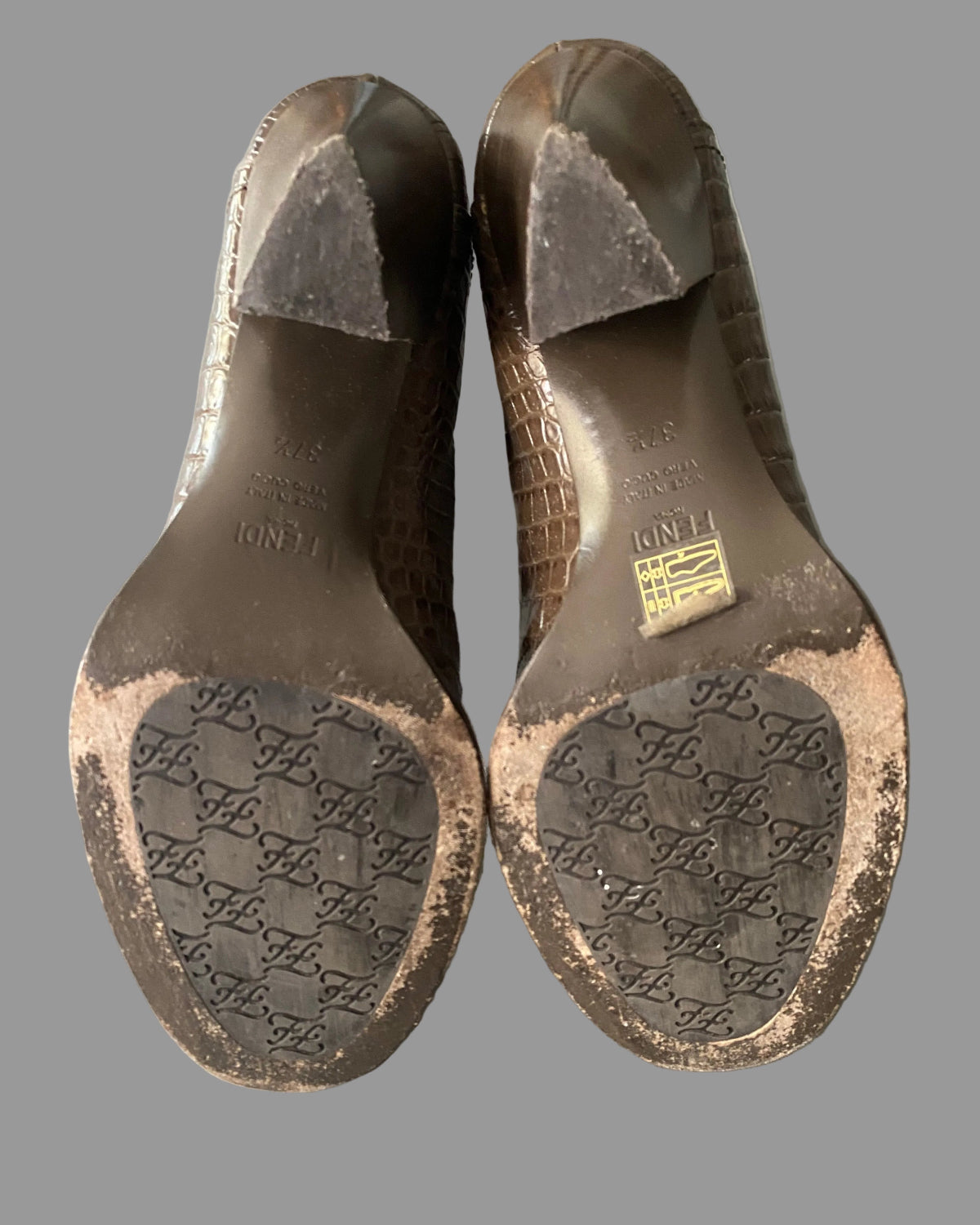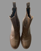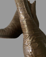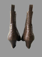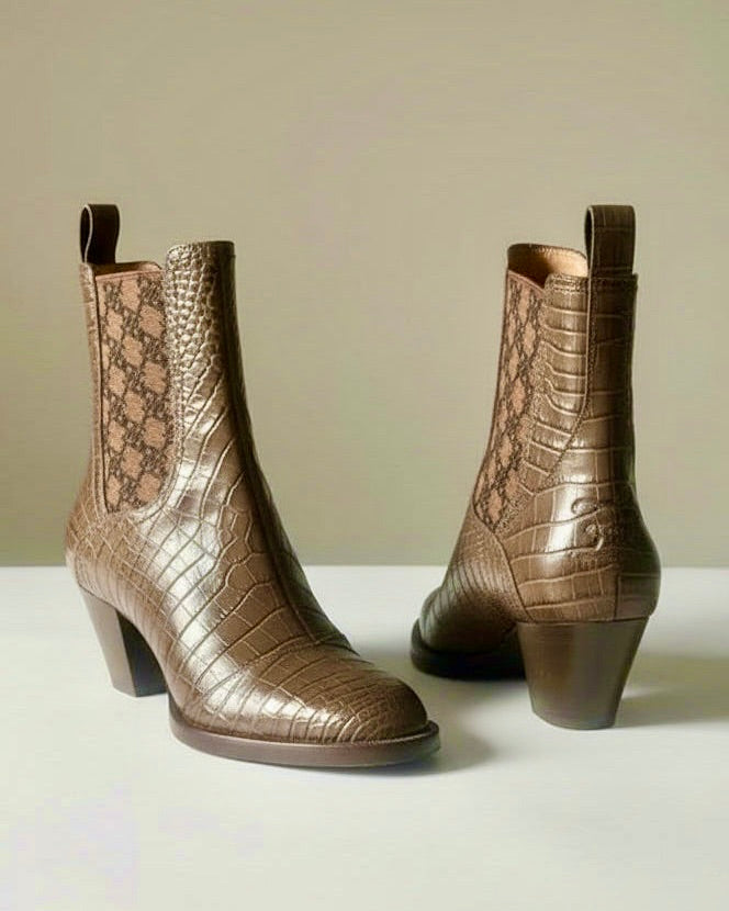 Elevate everyday looks with these Fendi Karligraphy ankle boots in brown croc-embossed leather. Featuring a Western-inspired pull-on design, logo elastic side panels, a stacked block heel, and embossed logo at the heel, they combine comfort with iconic Fendi style.