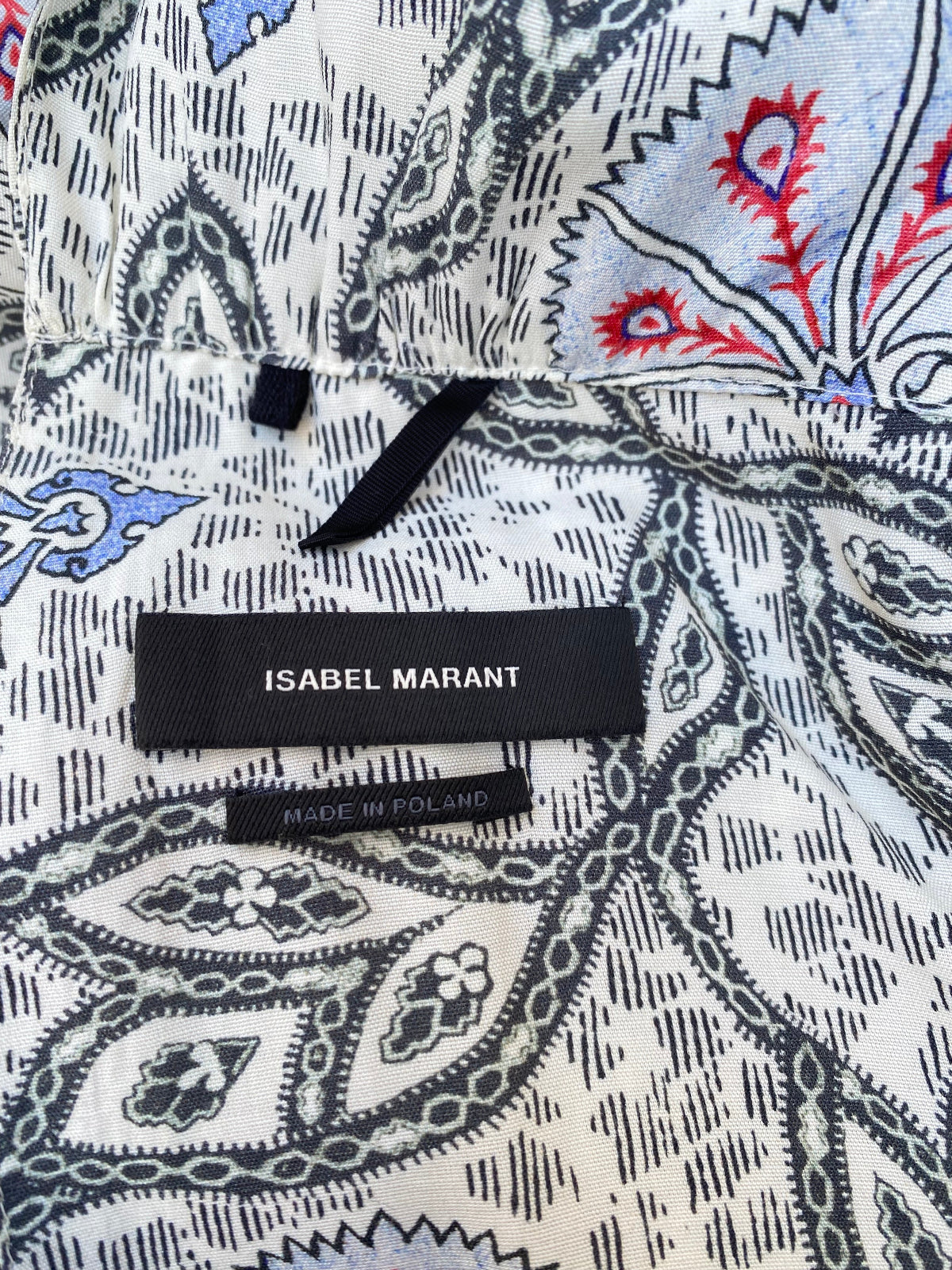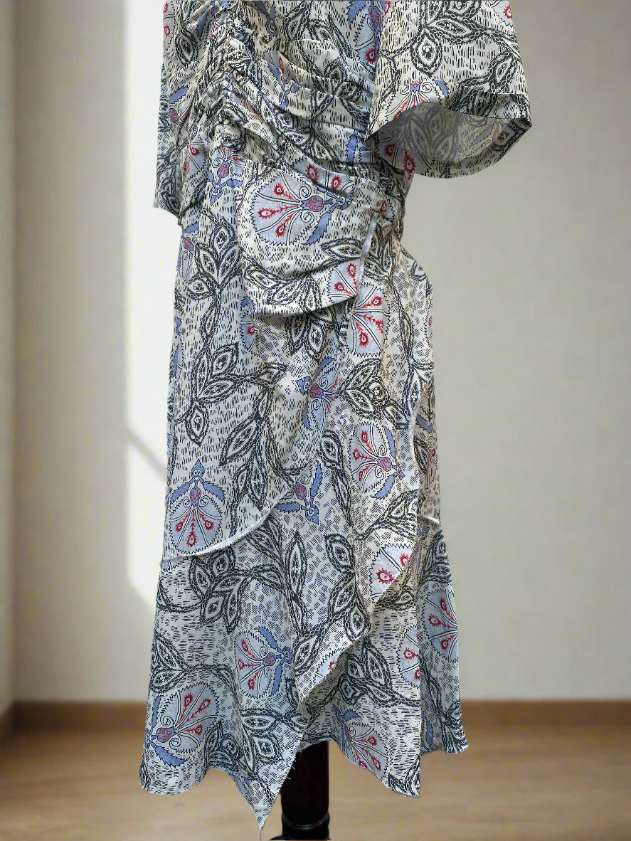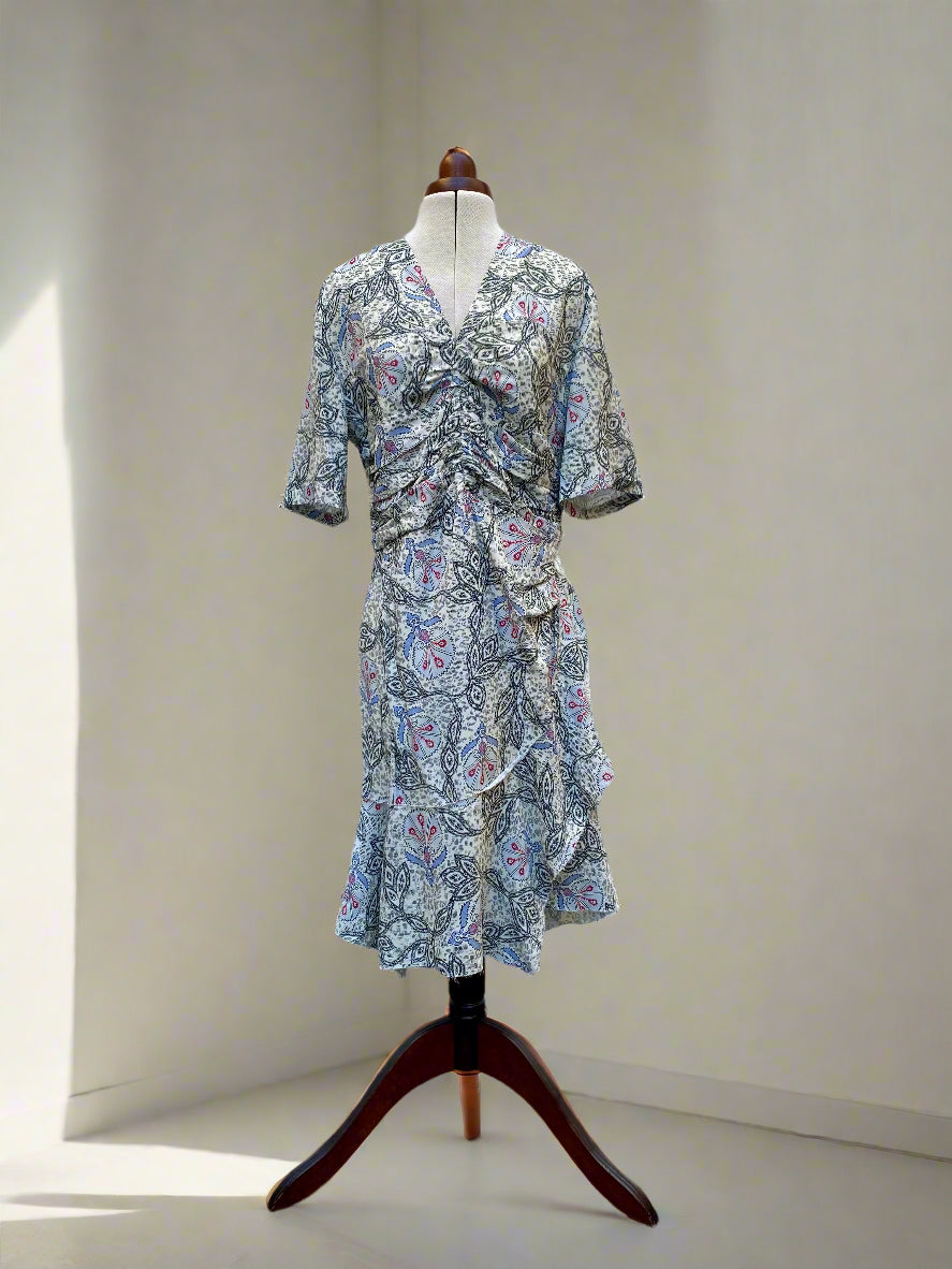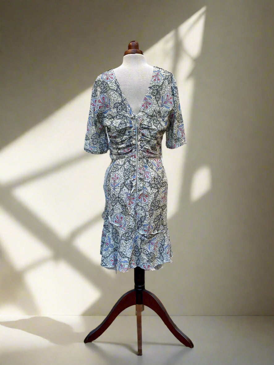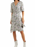 Isabel Marant printed ruched dress. The ruffled dress features a V-neck at back and front with an exposed rear zip fastening.