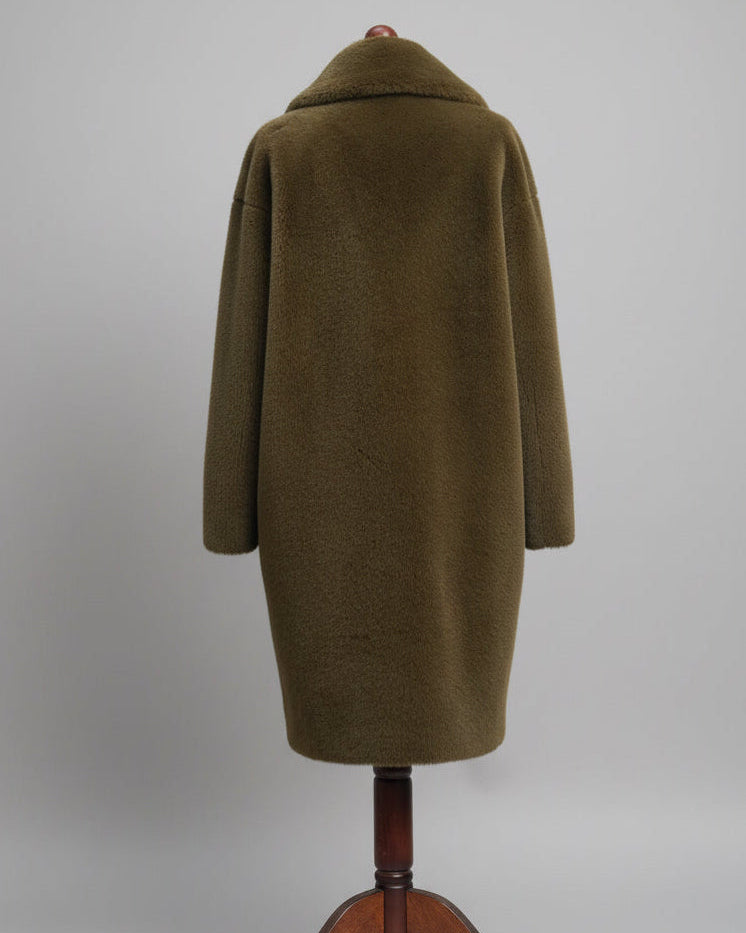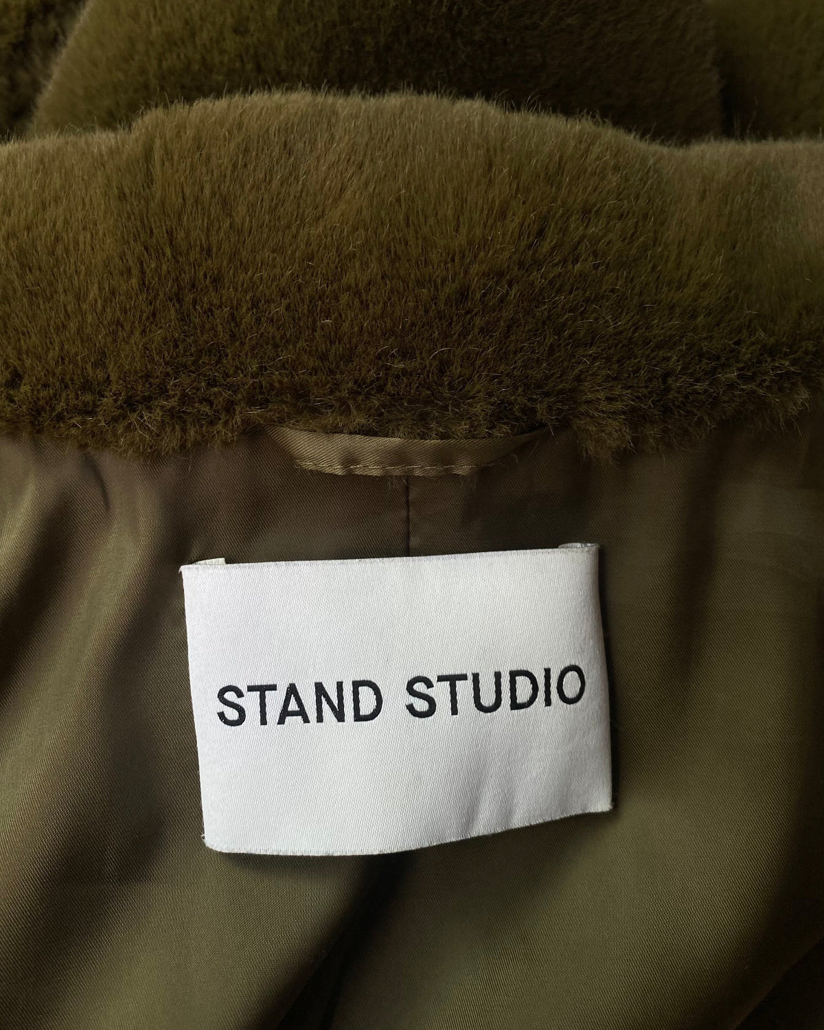 Stand Studio’s iconic Camille Coat in a timeless khaki shade, crafted from luxuriously soft faux fur for warmth and effortless style. Designed with a relaxed cocoon silhouette and dropped shoulders for a modern, oversized fit. Concealed snap-button closure, side slit pockets and internal zip pocket. A sought-after Stand Studio piece that adds texture and understated elegance to any fall-winter wardrobe.