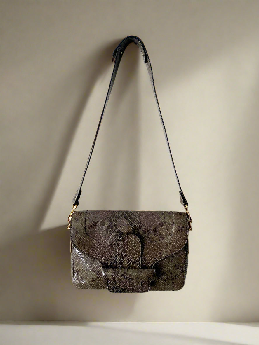 Snake-print exterior in elegant brown tones for a modern, textured look.