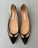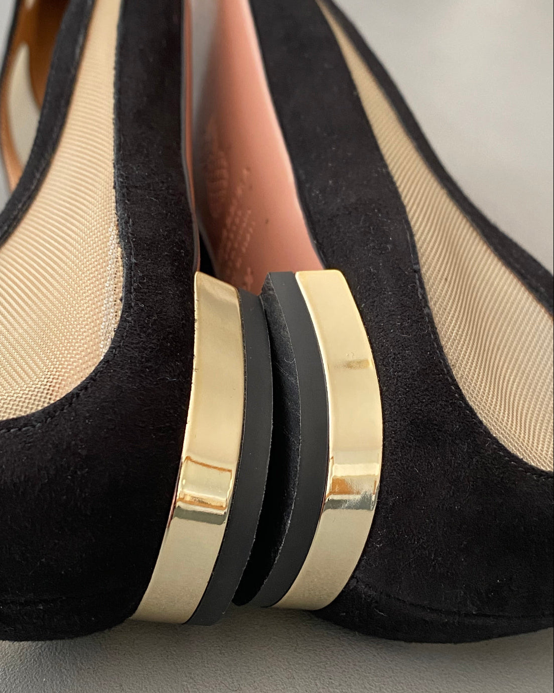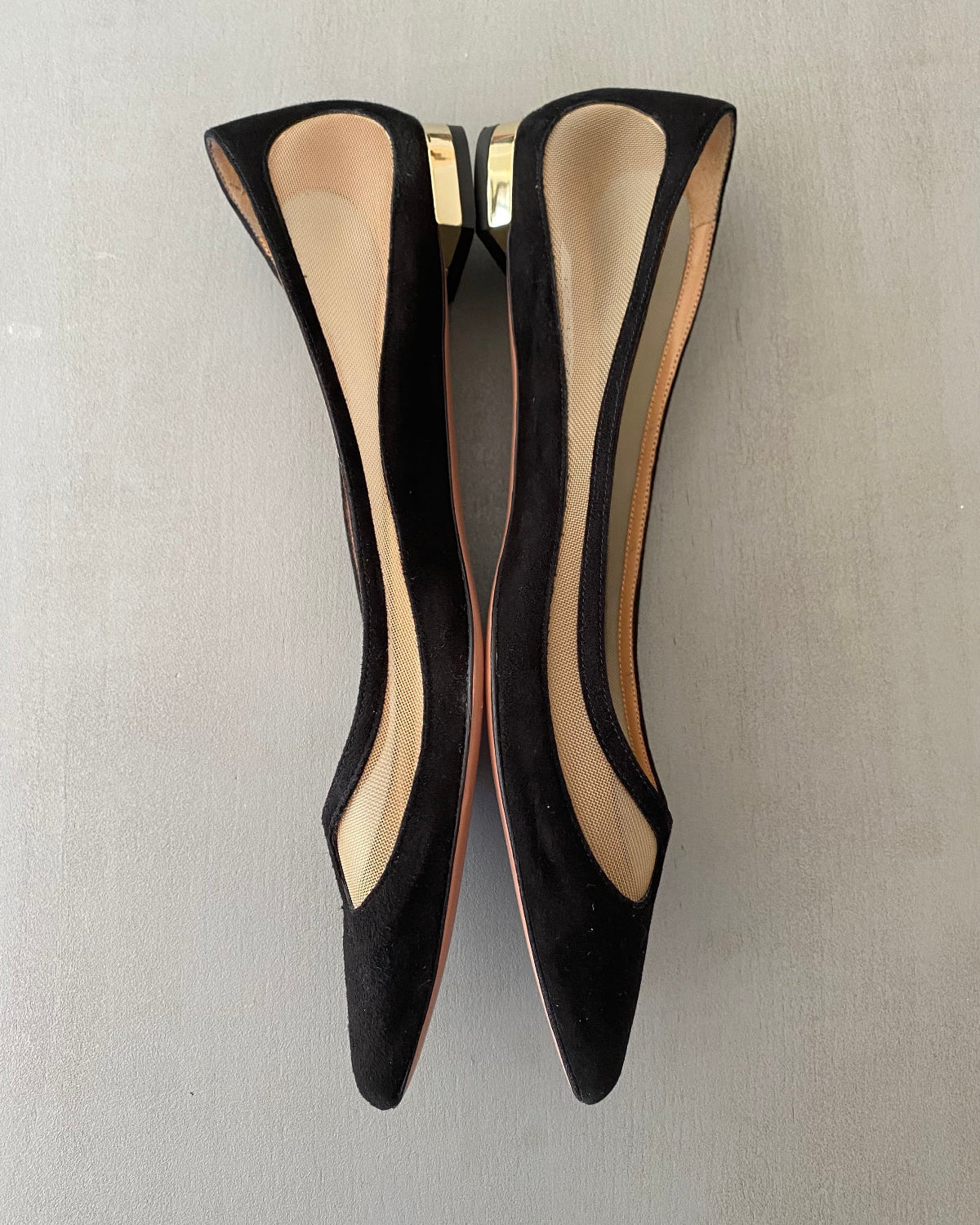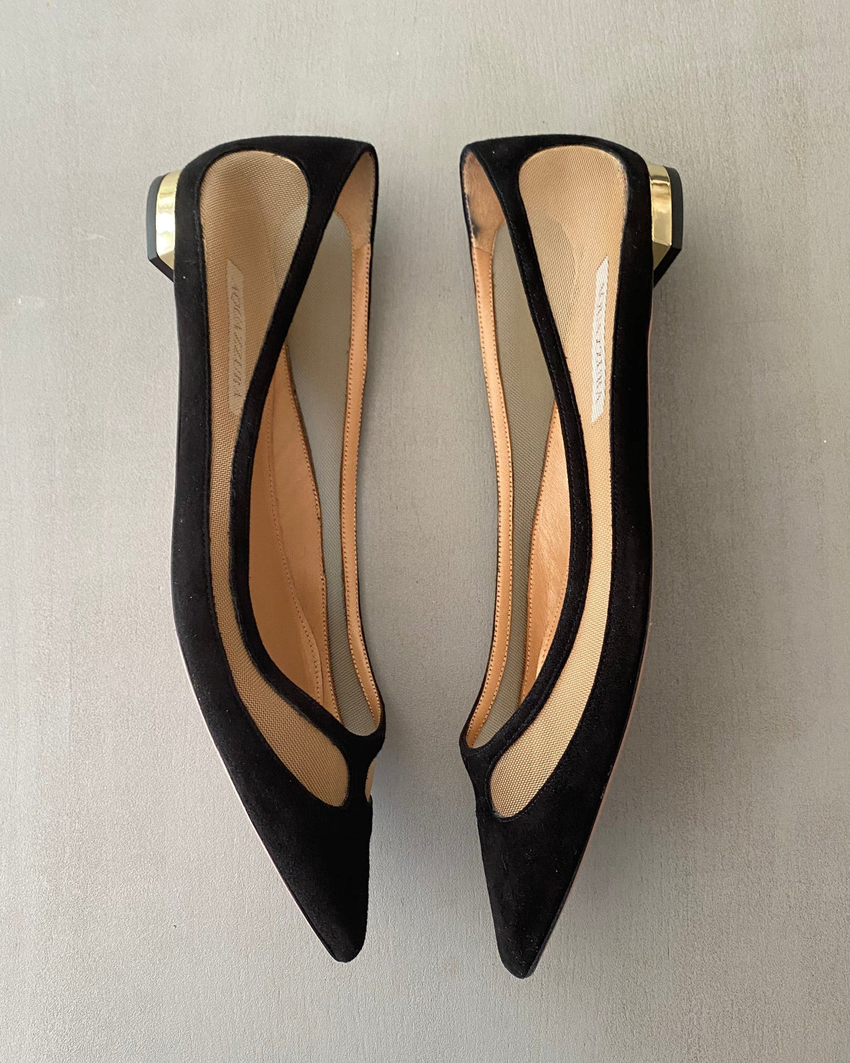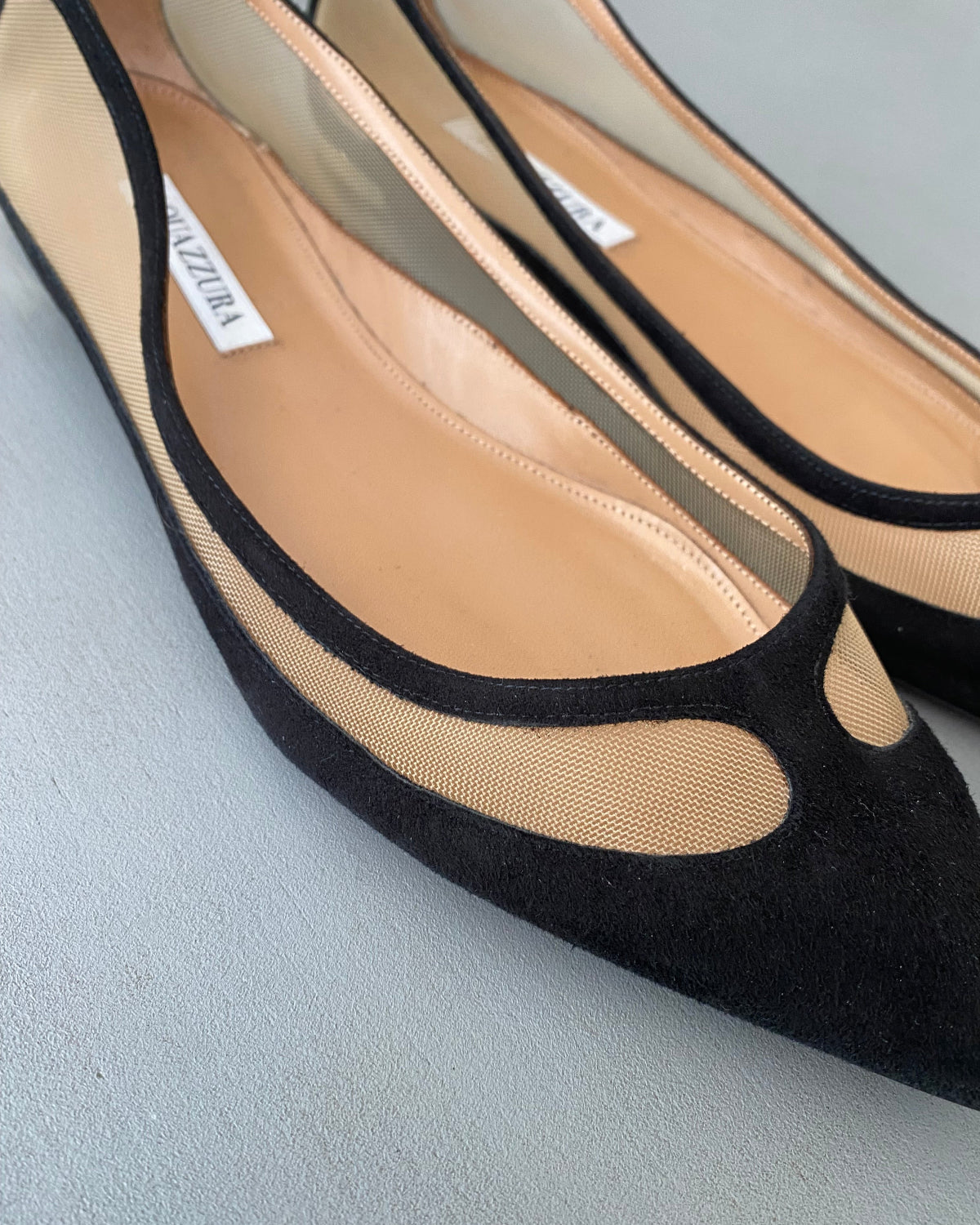 Aquazzura Amal black suede and nude mesh cutout ballerinas. The pointy ballet flats feature gold-tone pancake heels and leather soles.